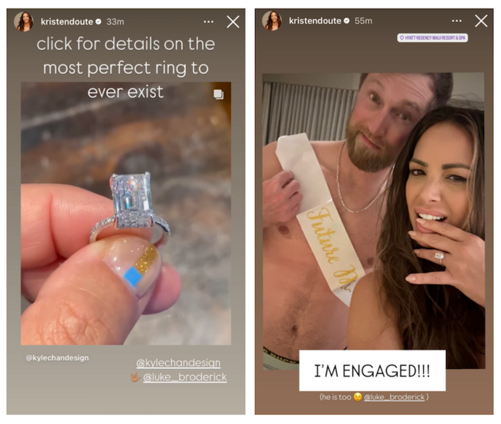 Kyle added in a September 6 Instagram post The ring Luke ordered for Kristen features a 14K white gold band along with a elongated 4.27-carat emerald-cut diamond, complemented by additional white diamonds on both the band and halo setting.